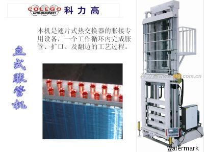 - 本机是翅片式热交换器的胀接专用设备,一个工作循环内完成胀管、扩口及翻边的工艺过程。性能稳定、可靠,整机采用进口优质元器件,全机保护功能完善。