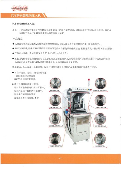该机目前主要用于汽车制造行业中转向系统的装配流水线上,该机采用PLC控制,客户通过改变程序和更换工装来完成各种需把轴承压入工件的装配工序。伺服系统实现压入过程中的轴承精确定位,检测并自动排除不合格工件。