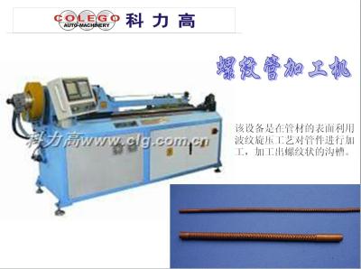 该设备是在管材的表面利用波纹旋压工艺对管件进行滾压波纹加工,加工出螺纹状的沟槽。使制品具有更灵活、多方向、高强度的可弯曲性。其螺纹形状可通过操作控制部分对预设参数的改写而改变。该设备制品广泛用于空调机及其需要类似可弯曲性螺纹管的制品。